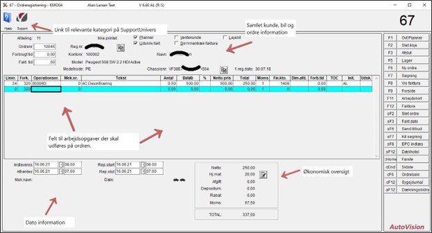 Ordreregistrering forsiden er opdelt i tre afsnit som vedrører ordren, kunden/debitoren og bilen/vognen.